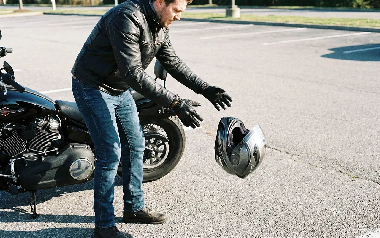 The helmet slipped from my grip at waist height and hit the asphalt with that sickening hollow thunk that makes every rider’s stomach drop.